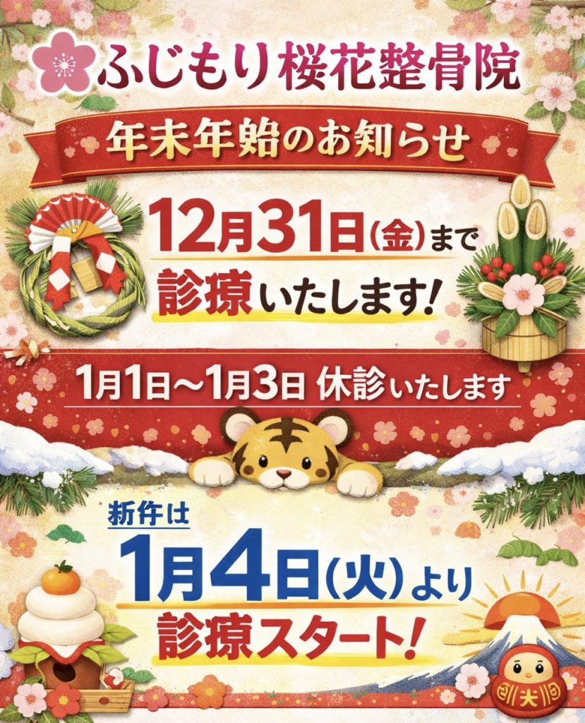 .今年もあとわずか‼️.今年も例年と同じく12/31の昼まで診療してます🙋♂️.2026年の始まりは1/4から通常診療になります🙌. ふじもり桜花整骨院 鍼灸師募集 八王子 続きを読む